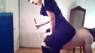 Mistress Eleise de Lacy spanks her male slave over the stool