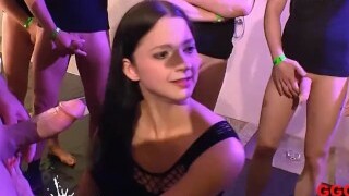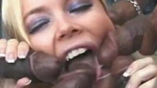 She surrounded by several black penises and screams with joy when they plow all her holes simultaneously