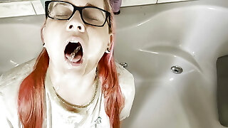 Shy uber-cute girl with pigtails showed her tight unshaved vag for nailed and get cum in her mouth
